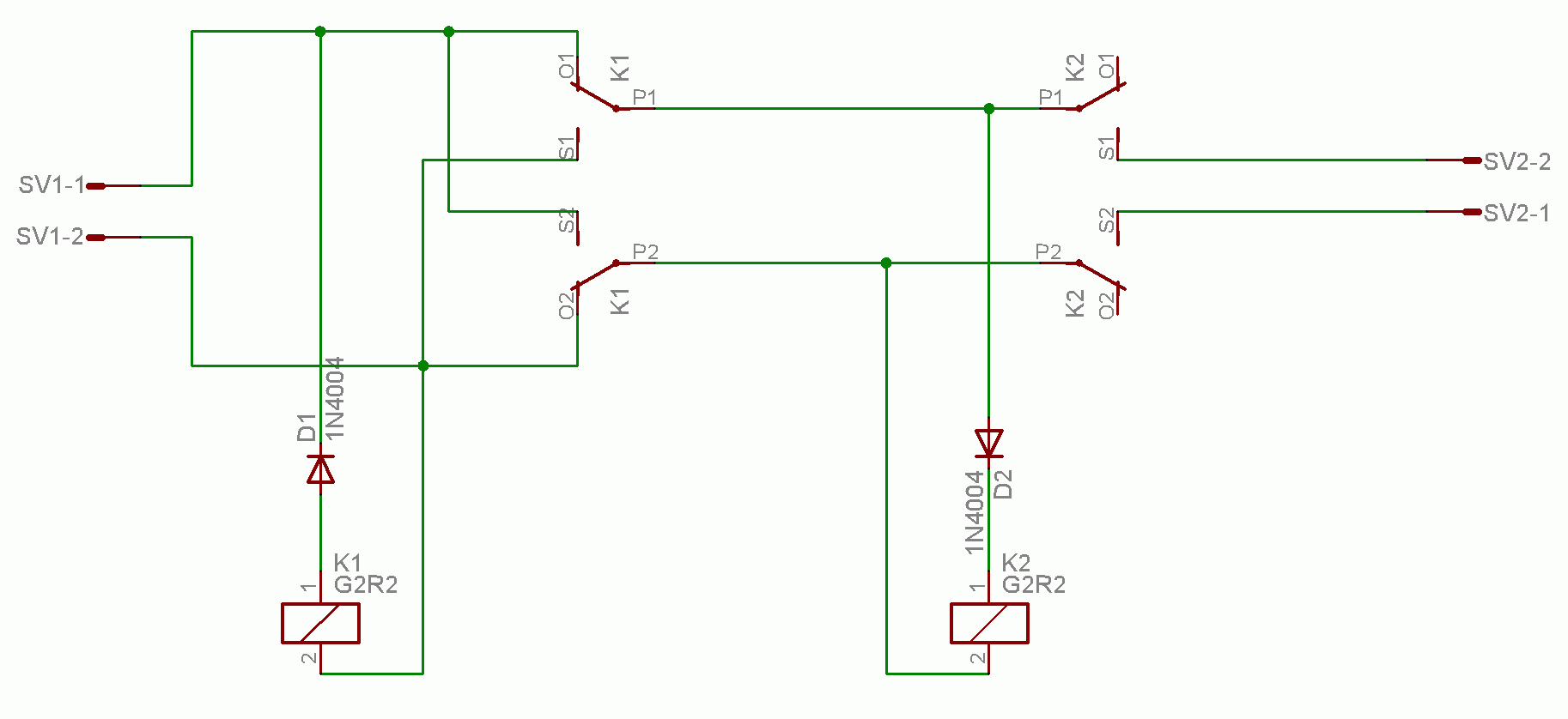Pokud se přivede napájecí napětí tak, aby na svorce SV1-1 bylo kladné napětí, přitahuje relé K2 a tím připojí SV2-2 také na kladné napětí a spotřebič je napájen. Pokud je polarita opačná, relé K2 nepřitáhne ale přitahuje relé K1, tím se změní polarita na vstupu obvodu relé K2 a to přitahuje a na svorce SV2-2 je opět kladné napětí. Relé K1 tedy kontroluje vstupní napětí a pokud je polarita opačná, než je potřeba, tak přitáhne a polaritu otočí. Relé K2 přitahuje až v okamžiku, kdy je polarita v pořádku a tím přivede napětí na výstup. Pokud by se nepoužilo, tak se po připojení napájení s opačnou polaritou na chvilku objeví na výstupu opačné pólované napětíRelé K1 přitahuje v obvodu: svorka SV1-2, cívka relé K1, dioda D1, svorka SV1-1
